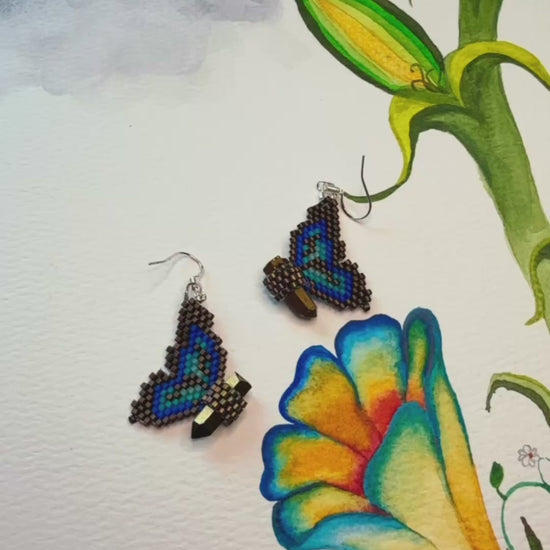 Butterfly Earrings; Bronze with Blue Ombré Butterfly Wing Pattern. Golden tone Pyrite crystals. Sterling Silver Earring hooks, Delica beads. Light Weight