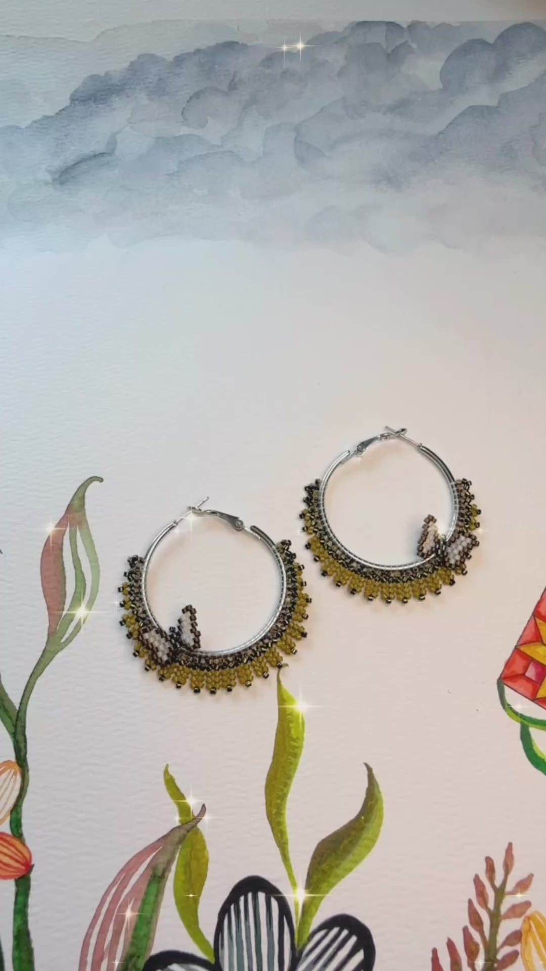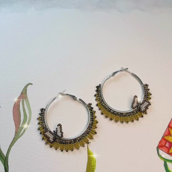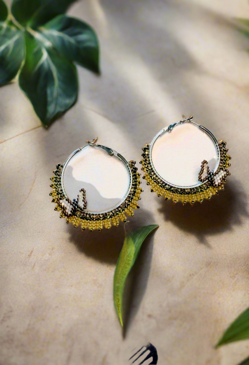 Rez Girl Hoops in size Medium, made with Delica beads, a beaded 3D Butterfly attached