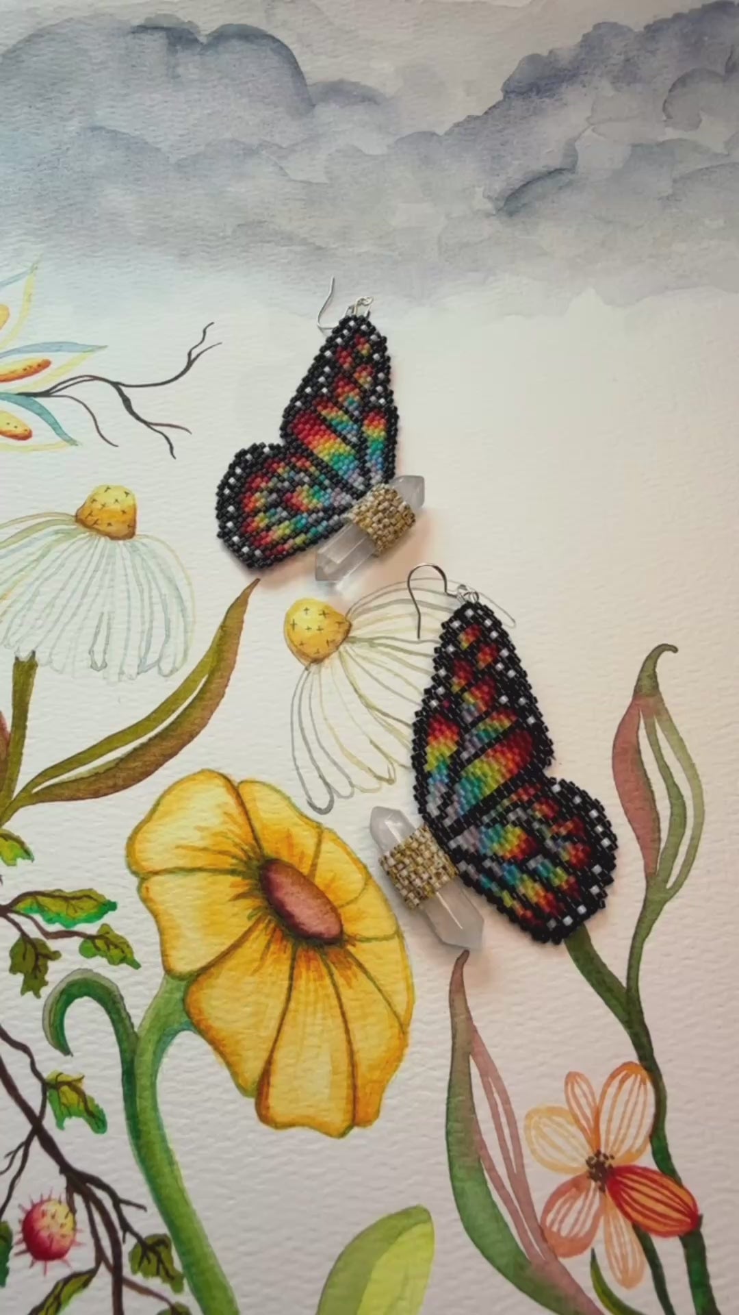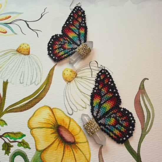 Butterfly Earrings; Rainbow Ombré Butterfly Wing Pattern. Quartz crystals. Sterling Silver Earring hooks, Delica beads, Picasso Delica beads. Light Weight